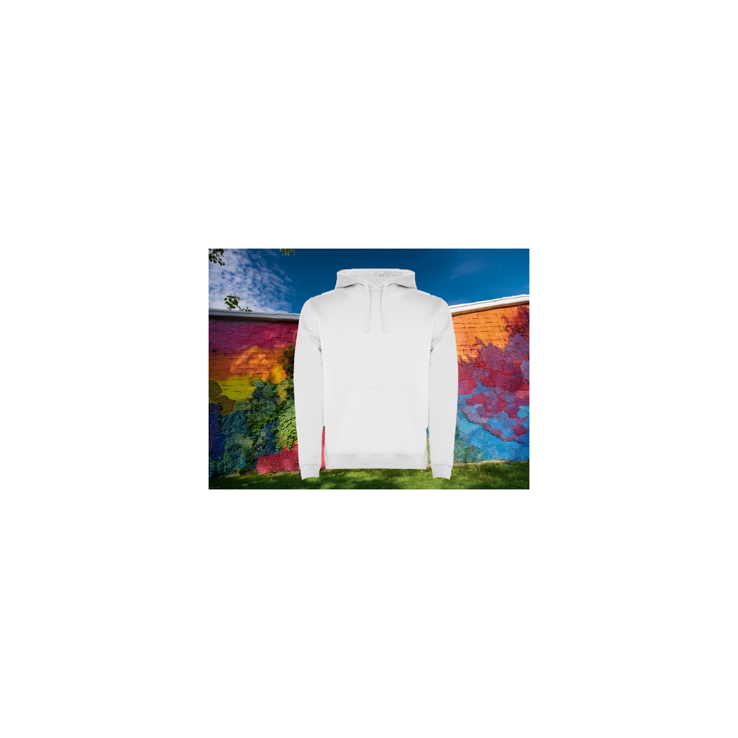 Sudadera con capucha de doble tejido, con cordón ajustable, en acabados solido y bicolor. Cubrecosturas en el cuello y bolsillo canguro. Punto canalé con elastano 1x1 en puños y cintura. Modelo de niño sin cordón. Estampado en el pecho y/o en el frente o la espalda.
