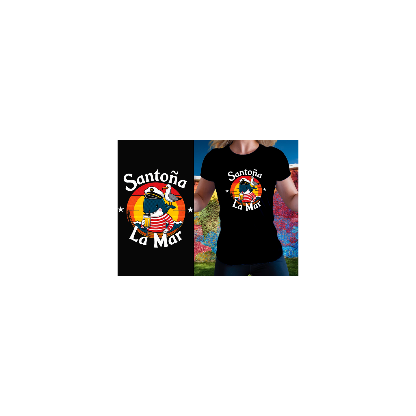 Camiseta original Santoña la mar, con una ballena disfrutando de un zumito fresquito.