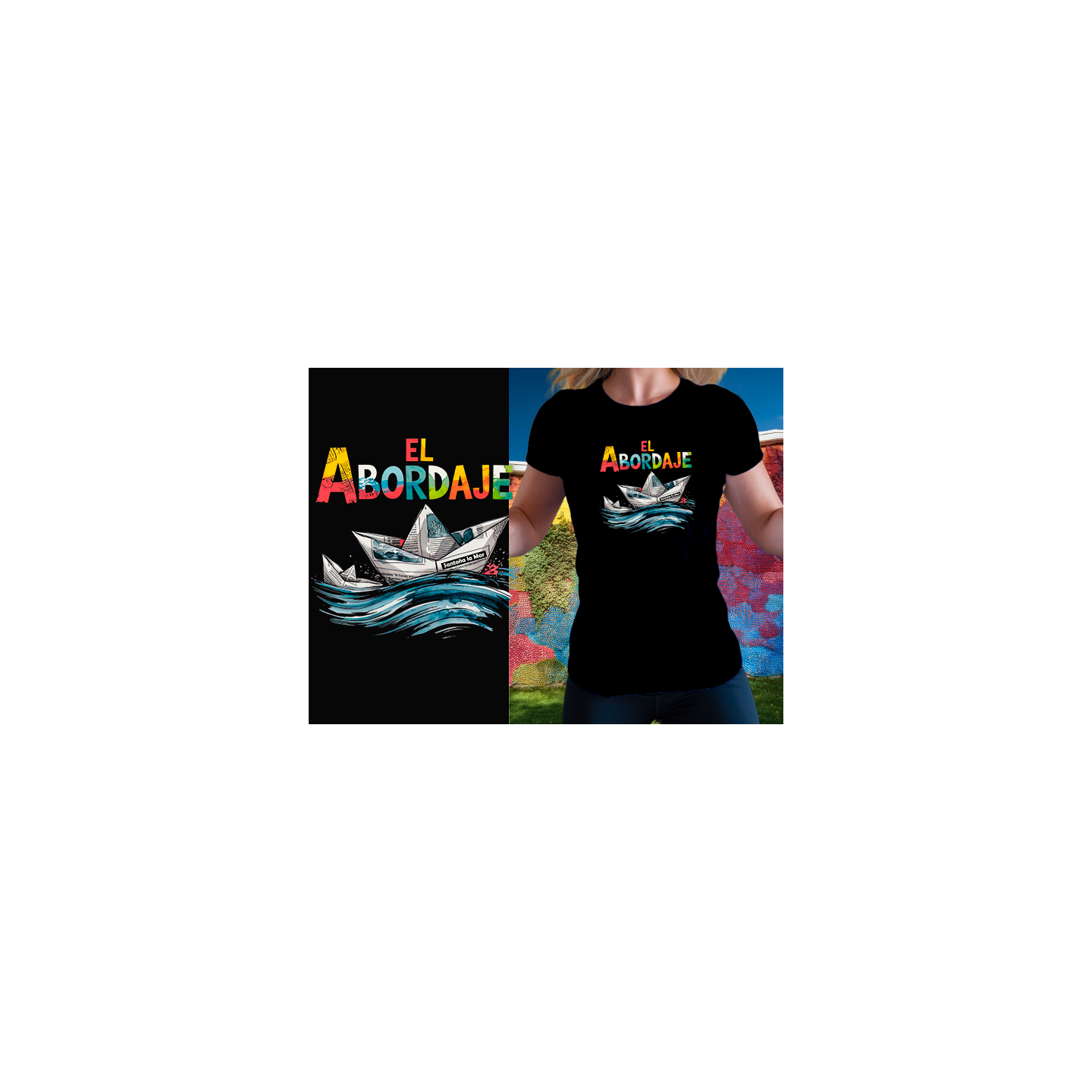 Camiseta original con un diseño de un barco de papel abordando a otro con el nombre de "El Abordaje".