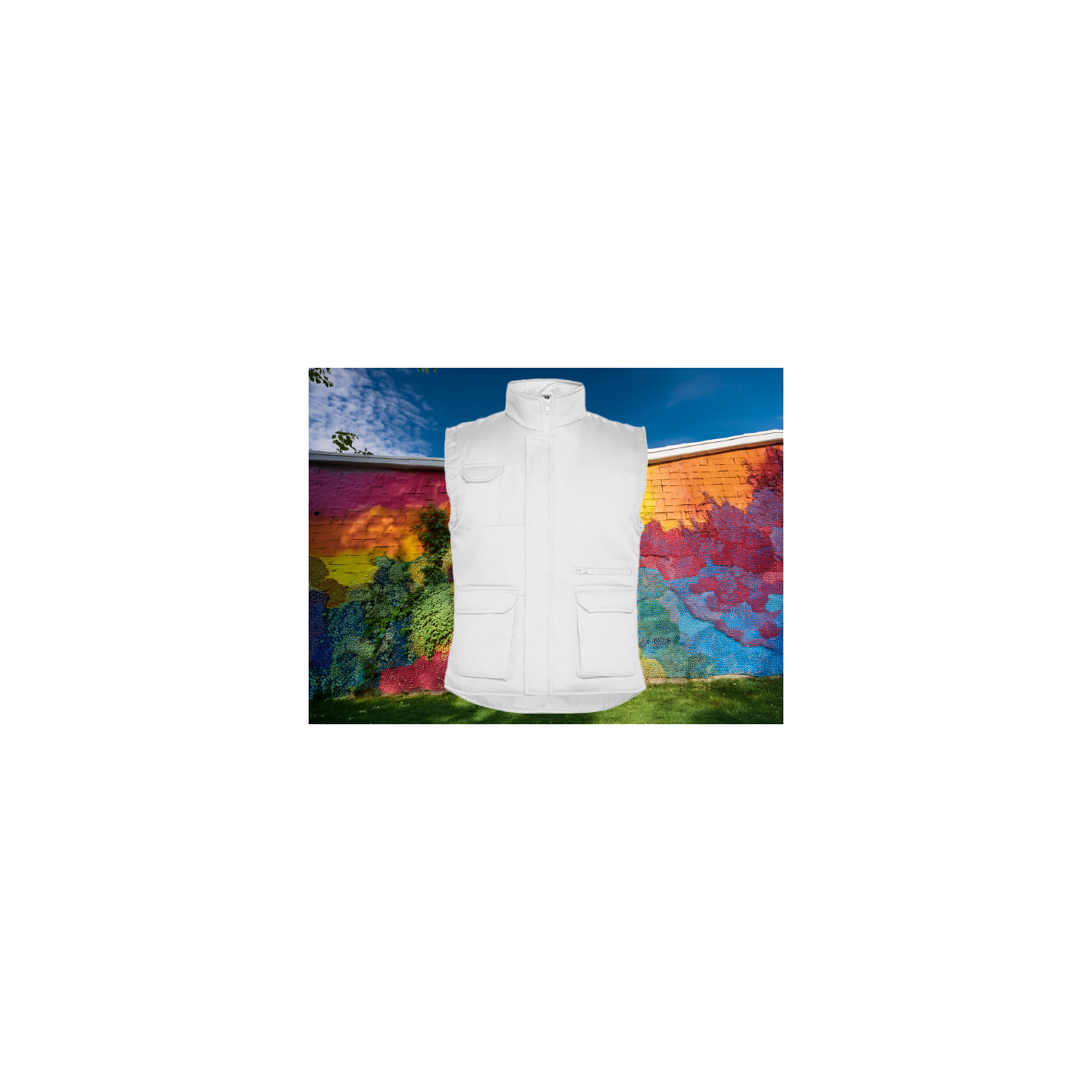 Chaleco laboral multibolsillos con cuello alto personalizable. Disponible en varios colores. Estampación de logo en el pecho.