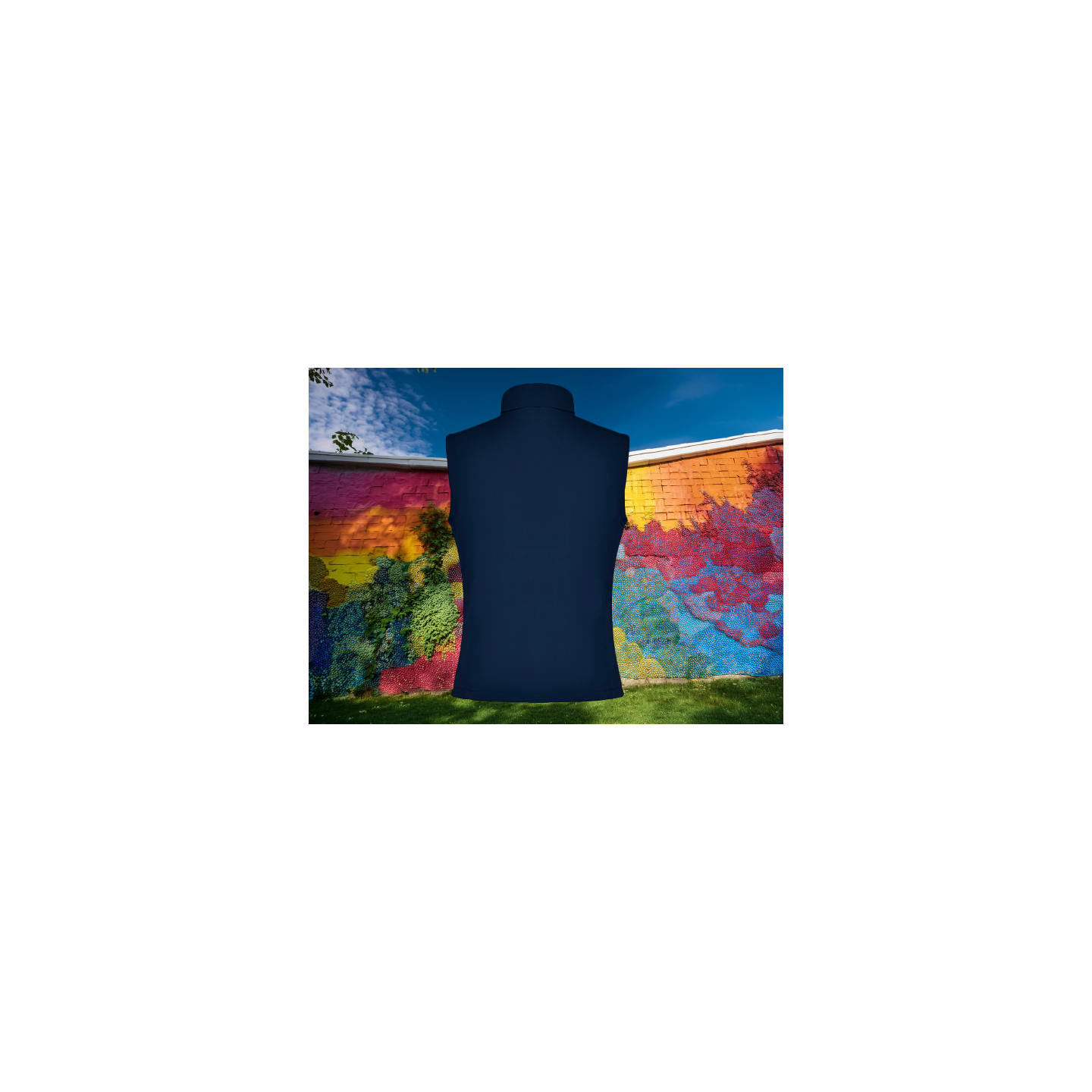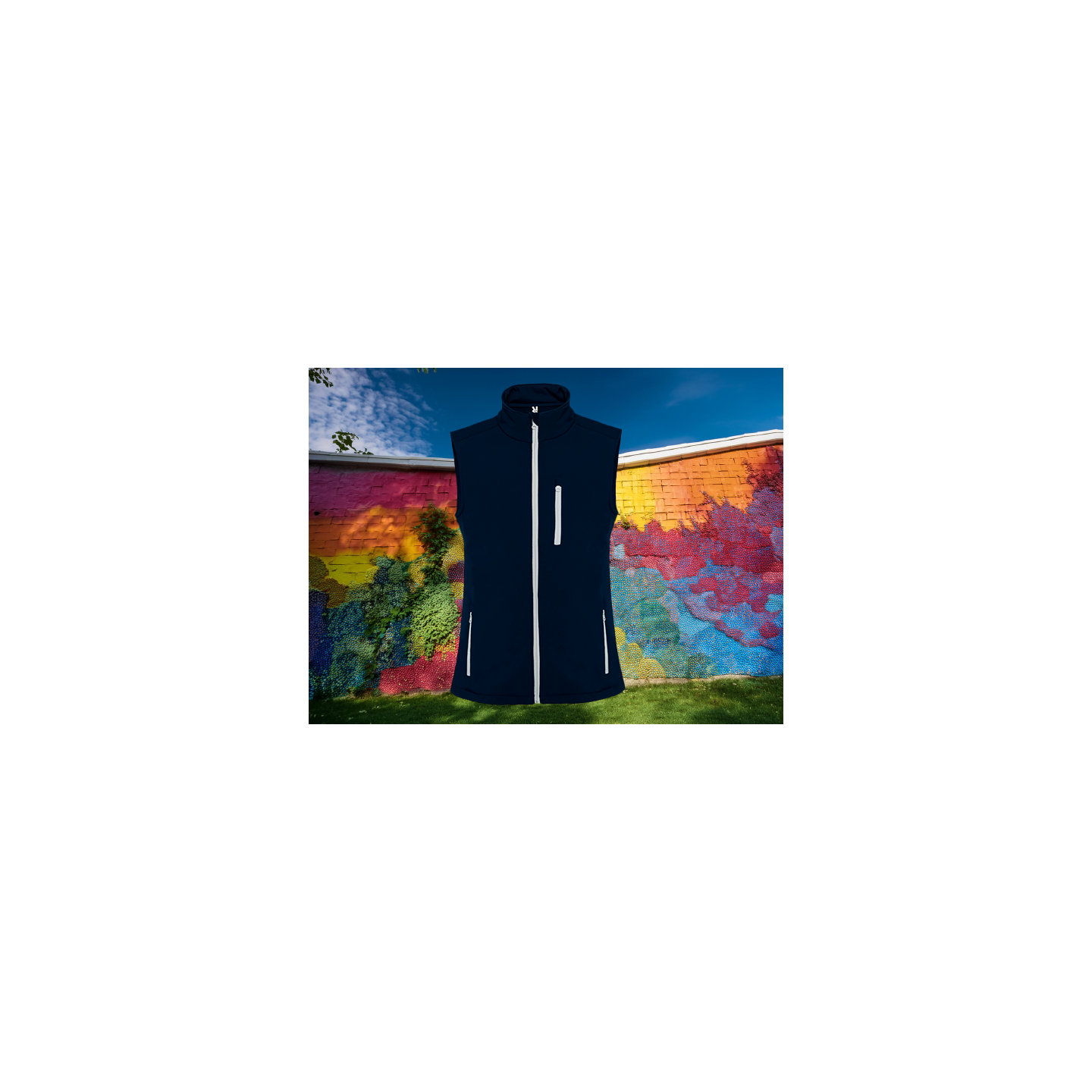 Chaleco softshell compuesto por 2 capas. Interior cálido en tejido micropolar. Cremallera central invertida a contraste con protector de barbilla y tirador. Dos bolsillos laterales y uno en el pecho con cremallera. Bajo con ajustadores interiores laterales.